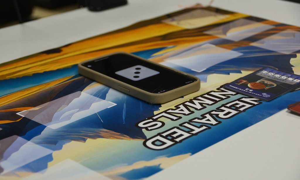 AR機能付きのオリジナルカードゲーム「Generated Animals」のセッティング。2つのカメラが2枚のカードを映し出し、カードのキャラクター3DCGがAR機能で出現するよ。