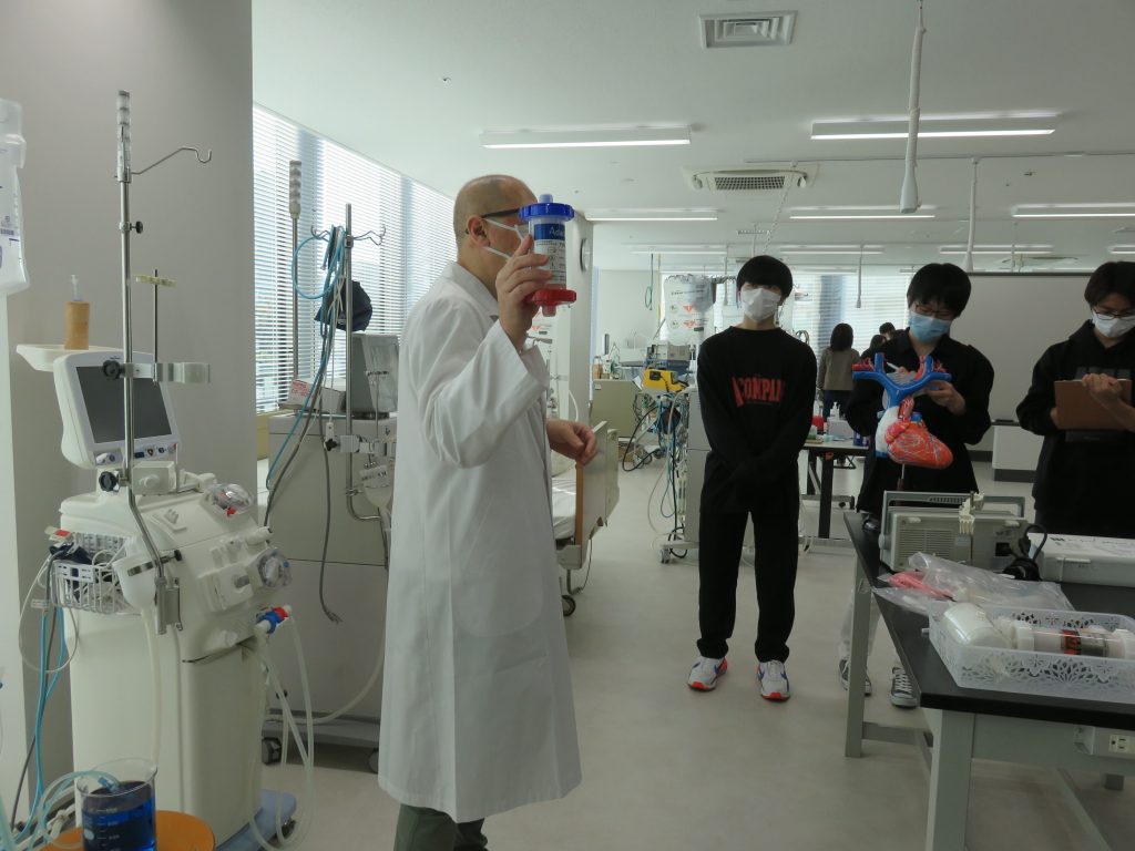2年生の医療的ケアの授業では、臨床工学科の先生の協力を得て、毎年特別授業を開催しています。