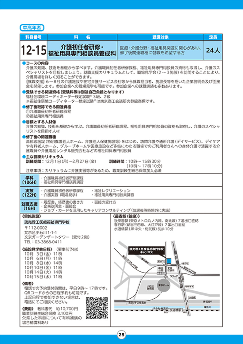 読売理工医療福祉専門学校では「介護初任者研修・福祉用具専門相談員養成科」を開講し、高齢者・体の不自由な方に接する機会の多い接客サービス業や介護現場で即戦力となる人材を育成することを目標としています。
